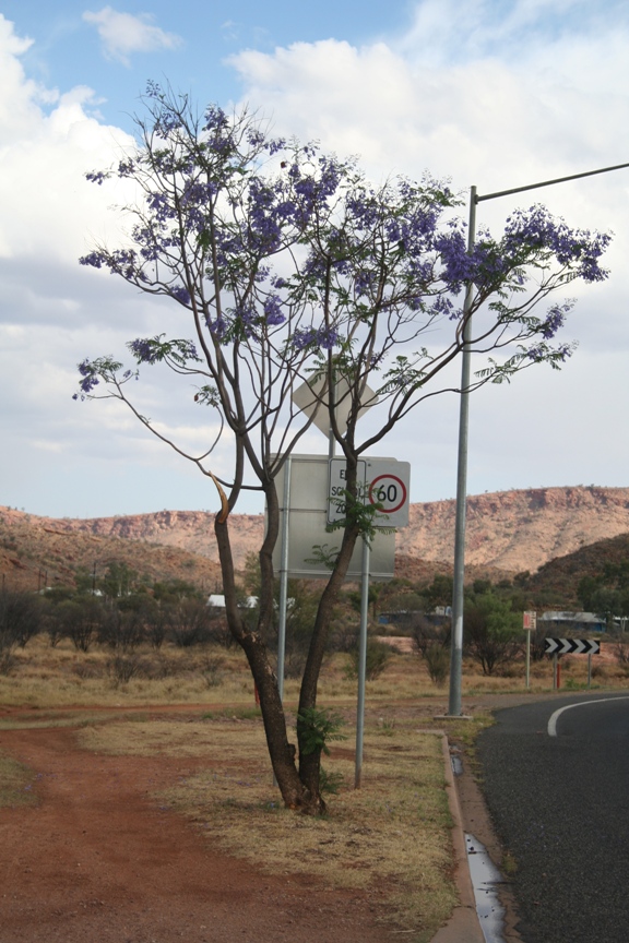 The jacarandas are farewelling me in flower. The second, less vibrant photograph below, is a jacaranda at the bend of Sadadeen Road, with Hidden Valley town camp and the East McDonnell Ranges (Yipirinya) as a backdrop. Yipirinya is the Arrernte name for the McDonnell Ranges, which are divided into east and west by a narrow gap at the southern end of town, through which squeeze the dry Todd River, a two-lane road with a precarious footpath running parallel to it, and a railway line.
