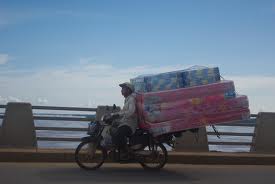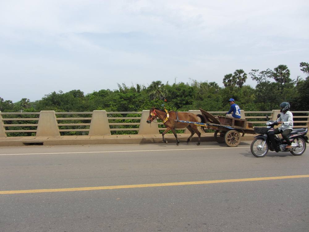 Slightly upstream from the Bamboo Bridge, is Kizuna Bridge. This is the first permanent bridge in Cambodia to have been built across the Mekong and it was only constructed as recently as 2001. We regularly cycle across the Mekong to visit villages and temples on the opposite banks of the river. It rises steadily to the centre, before sloping back down to the other side, with views for miles both upstream and downstream, beyond floating villages and fishing boats. Horse drawn carts, overloaded trucks, motorbikes crammed with people or produce and other cyclists constantly stream across the bridge. From the balcony of our house we look downstream to the bridge which lights up at dusk, with reflections on the water reminiscent of the city lights of Manhattan shining on the Hudson River at night.