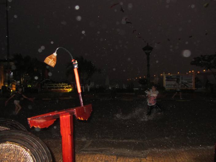 Thankfully on that particular night we had no rain, but the monsoons are slowly evolving into a nightly ritual with alarming blasts of overhead thunder, brilliant lightning flashes igniting the night sky and cloudbursts of torrential rain tumbling to earth at heavy and high speed, turning the streets into rivers within minutes. These storms provide a brief respite from the stifling humidity until it builds up again over a few hours. They also present new and novel portraits of Cambodia which, when wet, is entirely different to the Cambodia I thought I had become familiar with. Young people frolicking barefoot in deluged streets; a shirtless motorbike driver with one hand on the handlebar, the other holding a yellow umbrella over his orange-robed passenger; an open-engined truck overloaded with cane baskets cranking through the streets, covered meticulously with a huge blue canvas as though wearing it’s own custom-made raincoat. Cycling through knee-deep water, bicycle tyres surging through ripples of white water. Arriving to destinations soaked to the bone but refreshed and cool instead of soaked in salty sweat.