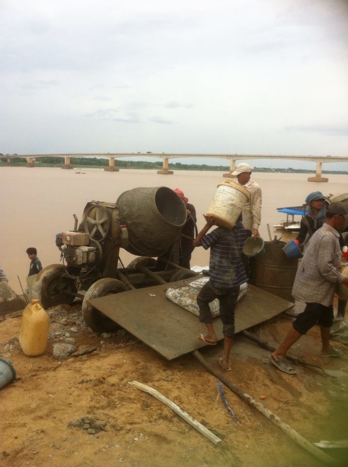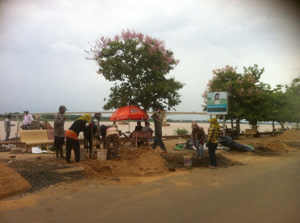 Over the road from me two noisy concrete mixers are whirring constantly on the newly-extended riverbank which has been widened by about two metres very recently, changing the embankment from a gradual slope to a steep-ish climb. The twenty-plus chain gang of workers are all covered from head (hats or traditional checked kramar scarfs) to toe (workboots at best; thongs with or at worst, without socks), including long sleeves and some even have tracksuit jackets or cardigans on. It is difficult to identify anyone but I can see that at least three of the workers are young women. When I have asked (usually women) why they dress in such hot clothes in this torrid heat, they explain that they want to protect their skin. There is a common admiration in Cambodia for light skin. Dark skin represents poverty as it is acquired by outdoor work such as farming and labouring. Skin lightening products are common in pharmacies here, the way that tanning products are seen in places like Australia, England and USA.