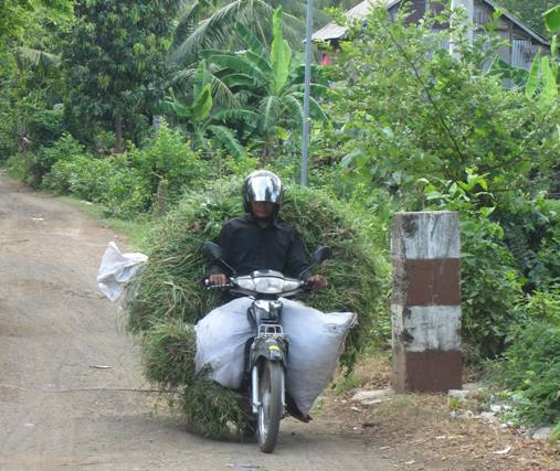 Oneday recently a driver, nurse, social worker and myself were driving through a very remote area when a man wearing only a traditional checked kramar wrapped around his waist like a skirt, appeared across a field, chasing a buffalo calf which was threatening to run into his rice field and trample it. As we drove by I couldn’t get my camera quick enough (see the first photo below) and my colleagues were far more amused at my alarm as I grappled for the camera with my eyes glued to the scene, than at this amazing sight. Once an admittedly less-than-ordinary photograph had been obtained they explained that buffalo have to be kept out of the rice fields which is why we see so many people collecting grass at this time of year. Once rice planting begins the animals are moved from fields into yards and under houses. This is only one example of the daily fascinations I experience in Cambodia while my local colleagues, many of whom have worked in the fields, take absolutely no notice.
