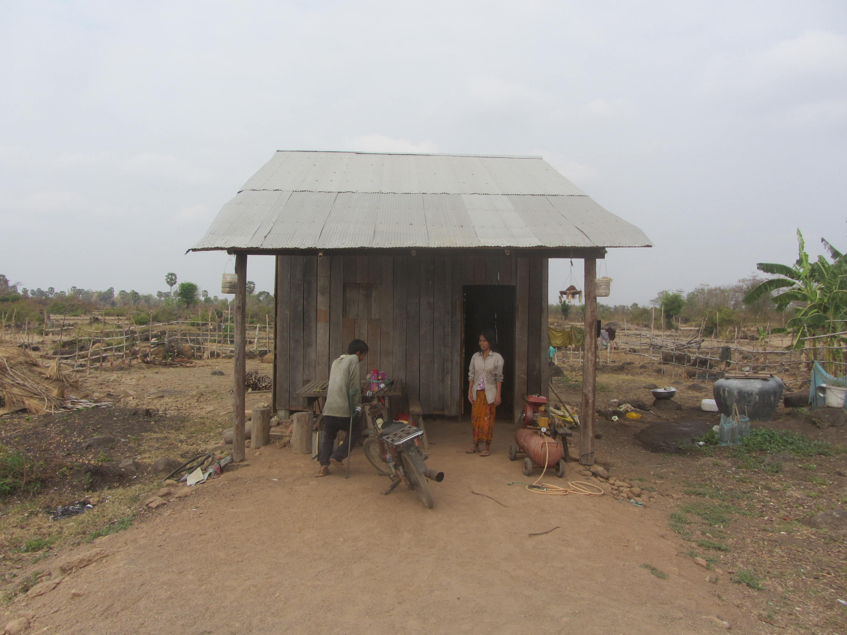 Dara is going to Phnom Penh next week to have the bone (finally) shortened. “The doctors” were meeting him at his village home this morning, which happened to be the time Chom and I had arranged to visit to say goodbye. Again, we picked up some rice for the two families out that way and headed along the bumpy dust tracks, stopping first at the disabled man’s home about 2km from the village. We delivered some rice and sat having a talk. I cuddled the baby who landed some faeces on my thigh as a goodbye present and they talked about needing a toilet. Chom said “they know you made the toilet for Dara, that is why they ask you”. We explained that I am going away for five months and while I am away, I will try to raise funds for a toilet for them but that I cannot promise. The father is very lame and it would be great to help him have a proper toilet. Despite his disability, he was out in the fields on his walking stick, working upon our arrival.
