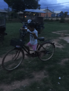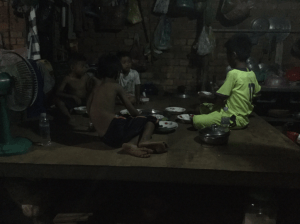 Cambodian hospitality is something I haven’t described enough. Seth’s family, post-motorbike, invited me for dinner and we had one of the most special evenings of my life sitting on a wooden platform under their palm leaf-tarpaulin-tin shelter. I counted at least 17 bodies living in this one little series of lean-tos. Dinner was cooked on open fires beside children pumping well water to splash over themselves as their evening bath, while others lazed in hammocks caring for babies, or played in the dust. Husband, wife, elderly parents and young children all worked together at the open fire, chopping vegetables, pulling pans down from hooks on the wall, stirring pots, dishing food out and instructing me to climb onto the platform as two fans were positioned near and pointed towards me. Seated cross-legged, we formed a circle around a tray of plates with a large pot of rice on the edge of the platform which was dished into bowls before we served ourselves from the plates of meat, vegetables, fish and omelette. The plates placed centre-circle were continuously refilled by one of the women who ate between tasks. The children waited, playing and relaxing, and I was told they’d already had a snack, which explained their patience as the adults ate in front of them. Seth’s elderly parents and the smaller children spoke directly to me in Khmer while Seth and Rav did an exemplary job at translating for me.