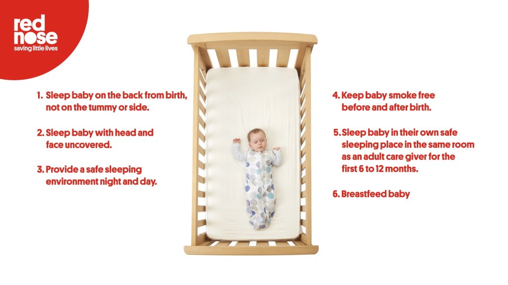 Keep baby’s head and face uncovered: Covering your baby’s head or face during sleep may cause them to overheat or suffocate. Red Nose recommends safely wrapping or swaddling newborns as this is a very useful way to soothe and settle your baby in preparation for sleep. Once your baby shows signs that they are attempting to roll, dressing them in a safe sleeping bag with a fitted neck and armholes and no hood provides a safe and comfortable alternative. Always place your baby with their feet at the bottom of the cot with a sheet and/or light blanket tucked in firmly at the sides of the cot. This will stop them from wriggling under covers and accidentally covering their face.