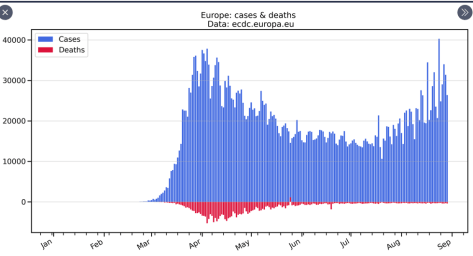 In these graphs the blue bars above the line are cases; red bars below the line are deaths.