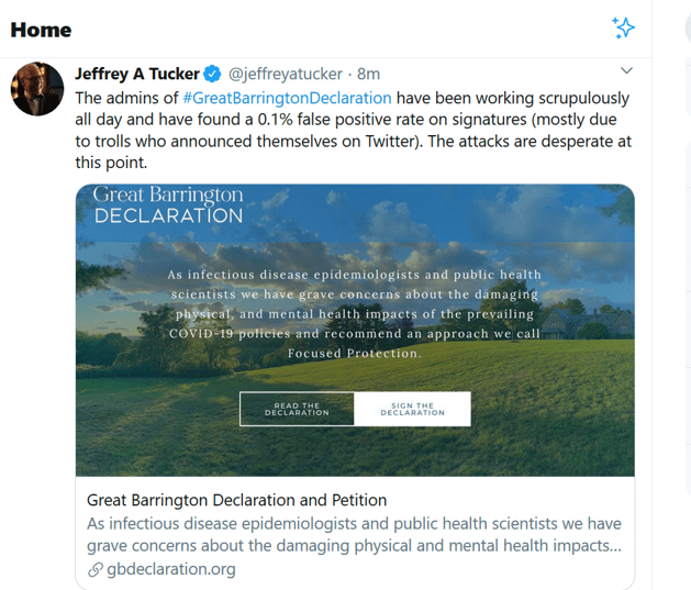 Since launching The Great Barrington Declaration they were initially ignored by mainstream media, but more recently targeted in an apparent smear campaign. Names such as “Dr Johnny Bananas” have slipped through the almost 200,000 online signatures to the declaration, and then touted as proof that the declaration is some sort of hoax. One journalist wrote “NEW: A small band of scientists has been pushing policies reflecting the (unfounded) idea that COVID isn’t a big threat“. They have been attacked for “appearing on Fox News” and speaking on disapproved-of podcasts, when they are in fact appearing on a range of media in order to publicise the message to a wide audience. Not one of these academics appears to enjoy the spotlight and their work in this case appears to come at personal sacrifice aside from the attempts to tarnish their characters and motivations.