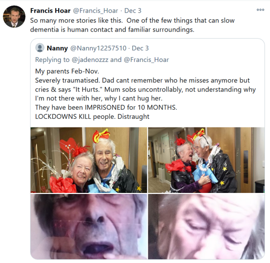 Her parents remain in the same care home, but apart. She regularly shares these pictures to highlight her distress. Francis Hoar is a barrister. A legal class action is coming, but it will be too late for many.