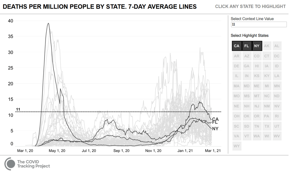 Sweeping lockdowns have been implemented in California and New York for almost a year, compared to Florida who ceased lockdowns after Governor Ron DeSantis consulted with Great Barrington Declaration advisors in September 2020. Covid-19 associated data for these three states is shown below. Florida has the second eldest population in the nation (after Maine); California has the 45th eldest population and New York has the 26th eldest population. California and New York remain in varying levels of lockdown, with playgrounds cordoned off, homelessness rising exponentially, high streets empty, children locked down at home and a severe mental health crisis playing out in the form of increased overdose deaths and suicides. This is not public health. By comparison Florida are open and functioning, their children are in school and their small businesses are trading whilst their public health policies focus on evidence based recommendations such as targeted protection of the vulnerable.