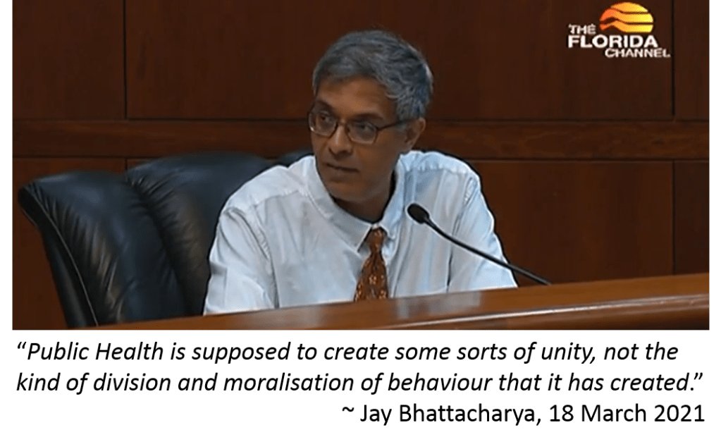 On Thursday 18 March Governor DeSantis held a roundtable discussion on public health with four of the world’s most esteemed public health experts (Sunetra Gupta, Scott Atlas, Martin Kulldorff and Jay Bhattacharya). These four supported DeSantis in his transition of Florida out of Lockdown towards a Focused Protection pandemic response, five months ago. The discussion, 1 hour and 45 minutes, was recorded on The Florida Channel.