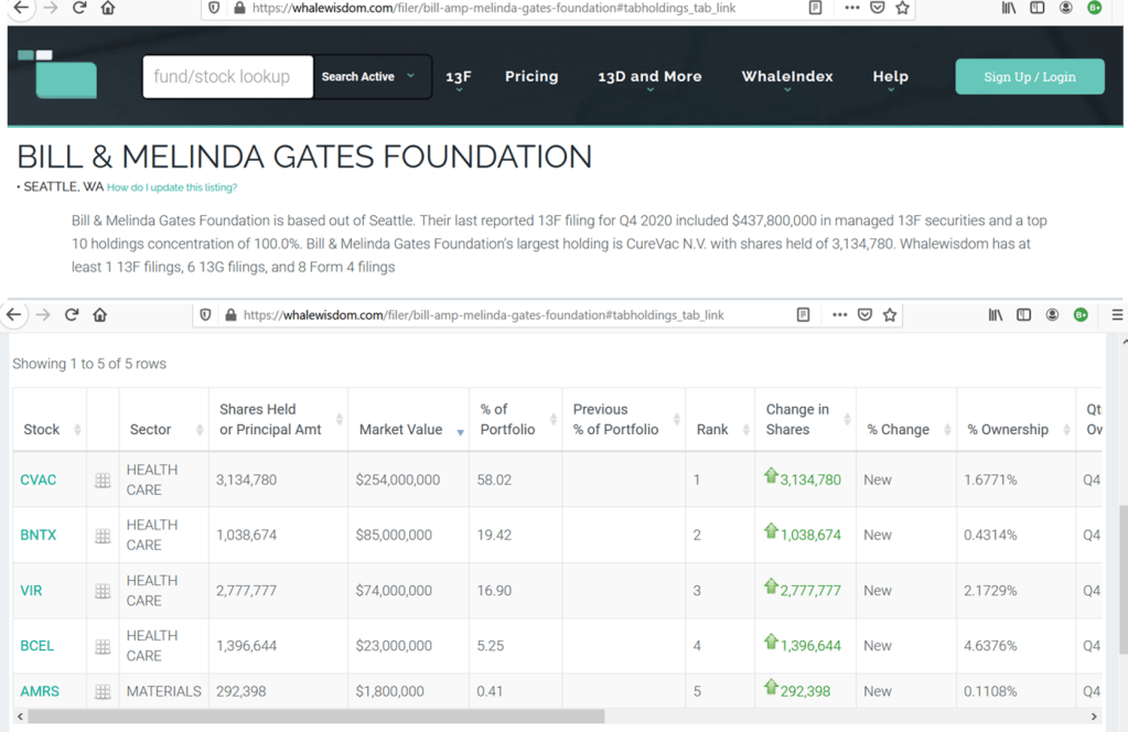 Whale Wisdom is a hedge fund tracking website. The Bill and Melinda Gates Foundation investment portfolio shows that 58% of their shares are invested in CureVac, a company dedicated to research into messenger RNA (mRNA) technology; and almost 20% invested in BioNTech who have partnered with Pfizer to create an mRNA vaccine. These happen to be associated with the “new normal” of everyone needing to show proof that they’ve been vaccinated appropriately (and probably repeatedly), before even basic freedoms can be re-established. In the UK vaccine passports for permission to sports and cultural events are already being implemented.