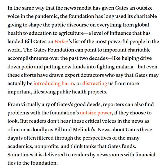 Gates openly outlines a “new normal” for the world with quite specific conditions, even suggesting that mass gatherings may never be permitted again. Is this not strange coming from an unelected non-official with serious conflicts of interest? His narrative is strong and convincing, for example this collection of comments but also relates to far-reaching influence across the world of journalism and news.