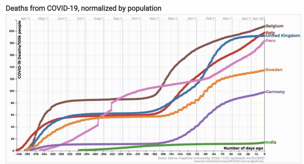 Firstly, the media are presenting cases and deaths in whole numbers that sound horrendous until you convert them to percentages of India’s huge population of 1.4 billion people. The current daily death rate in India of 2,600 is equivalent to 126 deaths per day in the UK, way below our peak rate and closer to what we are experiencing now. See the graph produced by JHU below to understand the context [2].