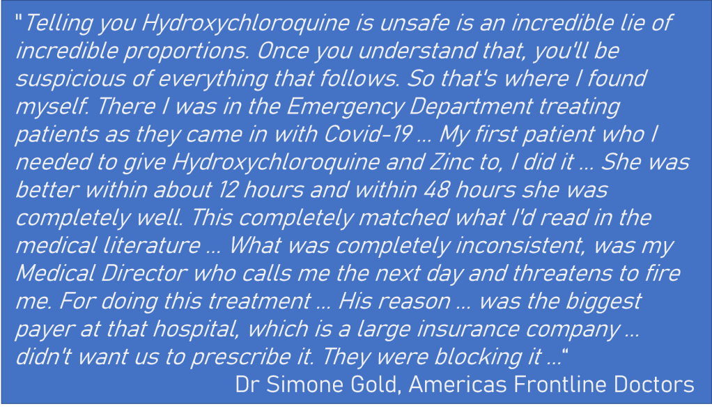 Existing drugs, well established as safe for human use, and documented as effective against Covid-19 disease, offer minimal profit. Ivermectin, Hydroxychloroquine, Budesonide, Zinc, Vitamin D and other medications are identified effective, existing, cheap and available treatments against Covid-19. Health insurance and politically driven service policies are deliberately obstructing effective treatment regimes with these drugs, described well by Dr Simone Gold, founder and spokesperson of Americas Frontline Doctors.