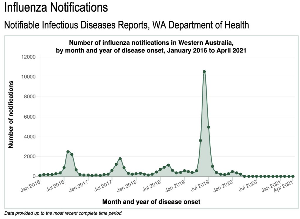 In 2020 New Zealand, population 5 million, had 26 Covid-attributed deaths which many believe justifies their ongoing lockdown policies. In 2019 Western Australia, population 2.5 million, had 80 influenza deaths including five young children, with a large spike in cases diagnosed. Yet it resolved, as infectious disease epidemics do via build up of population immunity, without most of the country even being aware, and without anyone having heard of “lockdown” beyond a prisoner control strategy.
