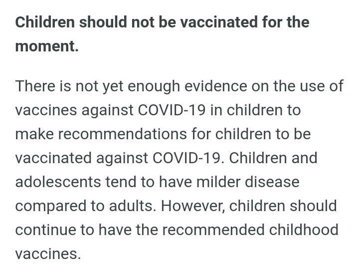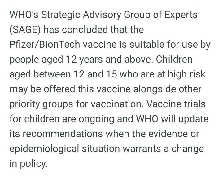 WHO this afternoon : Pfizer-BioNTech vaccine specifically named as suitable for children.
