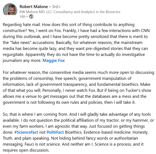 Robert Malone, who invented the mRNA technology used in a number of the Covid-19 experimental vaccines, shared this on LinkedIn. It would be pretty funny if it wasn’t so tragic. He is clearly a good and ethical person, accepting interviews with Fox News or not!