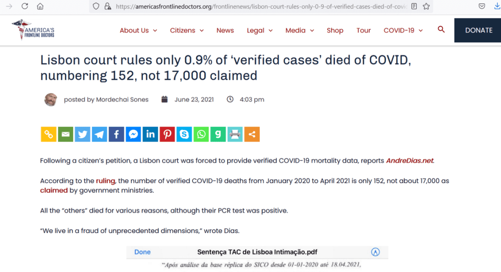 “According to the (court ruling), the number of verified COVID-19 deaths from January 2020 to April 2021 is only 152, not about 17,000 as claimed by government ministries … All the “others” died for various reasons, although their PCR test was positive“. Lisbon court rules only 0.9% of “verified cases” died of COVID