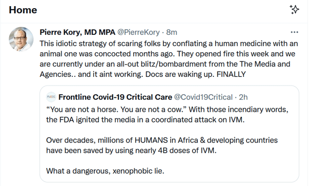 Dr Bret Weinstein is an Evolutionary Biologist who hosts a podcast called The Dark Horse with his wife, also an Evolutionary Biologist. Dr Pierre Kory is an Intensivist who has cared for many Covid19 patients since the beginning of the pandemic and has appealed strongly for early treatments against Covid19 to those at risk of disease. His (and many other clinicians’) appeals have been vigorously obstructed in favour of promoting global vaccination as the only solution.