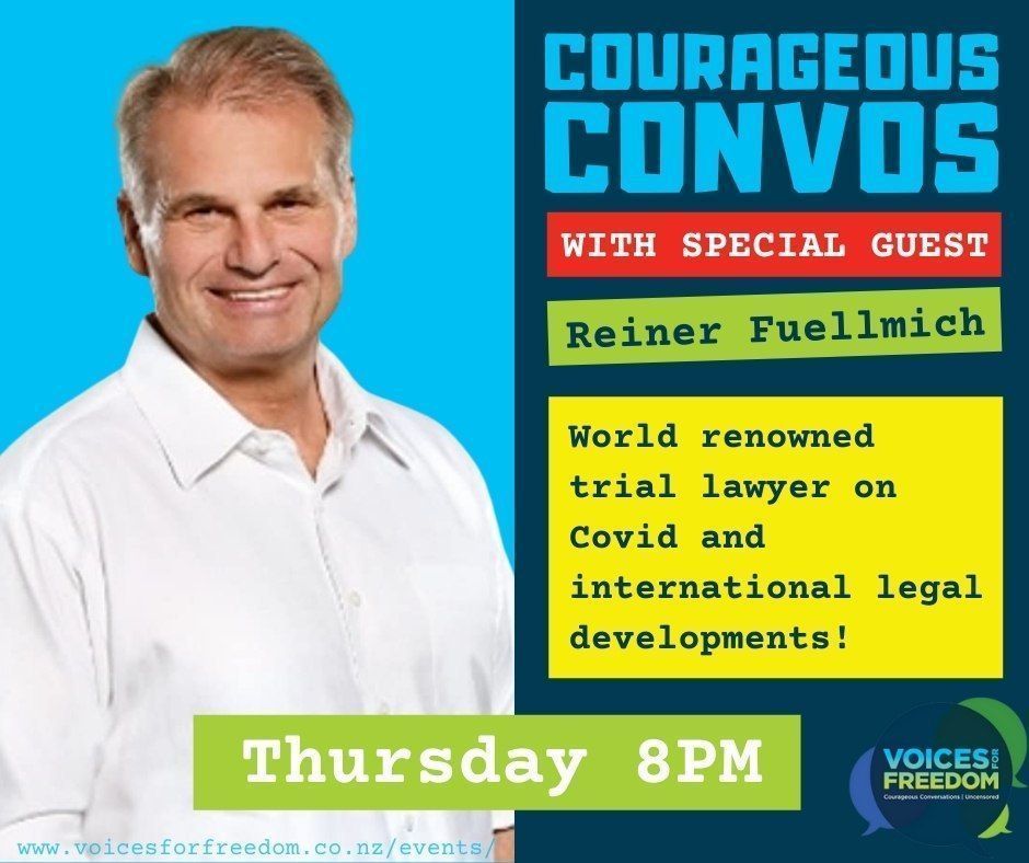 Meanwhile tiny little New Zealand are attracting some of the biggest names in medical ethics and decency. On Thursday Dr Reiner Fuellmich, leading the international legal offensive against this global disaster, will speak at Voices For Freedom.