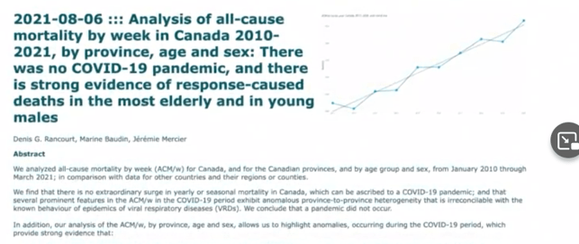 Professor Rancourt spoke to Rebel News presenter Drea Humphrey about his research findings relating to the Covid-19 pandemic. He discusses evidence to support an idea that Canada in fact did not experience Covid-19 as a pandemic, but that deaths in the elderly as well as young males were associated with the lockdown response.