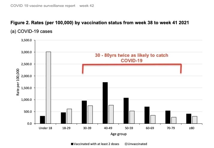 The most recent report from the UK government website clearly shows that, despite reduced hospitalisations and deaths, vaccinated people over the age over 30 years are twice as likely to become infected with COVID-19 than unvaccinated people (see graph)