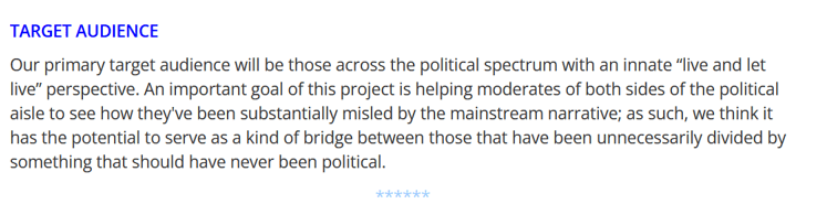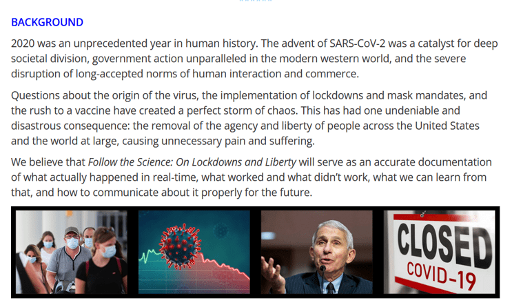 A docuseries is being planned by SoundMind Creative Group based in California. The trailer can be seen at “Follow The Science: on lockdowns and liberty“.