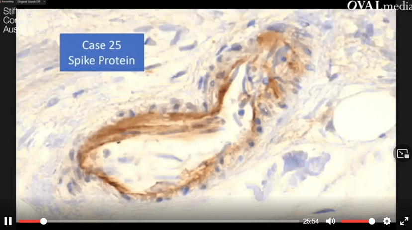 German Pathologist Dr Arne Burkhardt (at 11 min), reports on tissue samples of “vaccinated” individuals who died “at home, in the car or on the street”. This is an important differentiation from those in hospital whose treatment can obscure causality of death. He describes observed physiological changes including myocarditis, small and large vessel damage around heart and lung, changes in the spleen, lymphocytosis outside lymphatic organs which may be an auto-immune reaction, embolisms and foreign bodies.