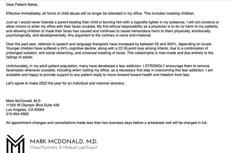 Dr Mark McDonald, Clinical Psychiatrist and medico-legal expert, is a member of Americas Frontline Doctors, who advocate for evidence and medical ethics. Yesterday he released the following statement, about the letter he has written to all parents of the children he provides care to.