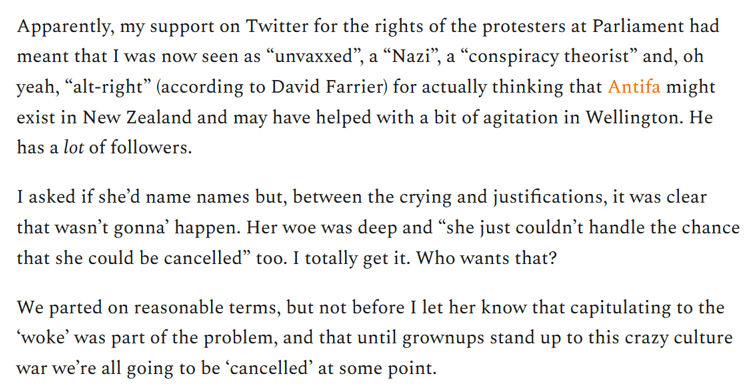 Rachel Stewart is a New Zealand journalist whose blog article Cows and Cowards outlines her experience with cancel culture. Makes for an interesting read. An excerpt here: