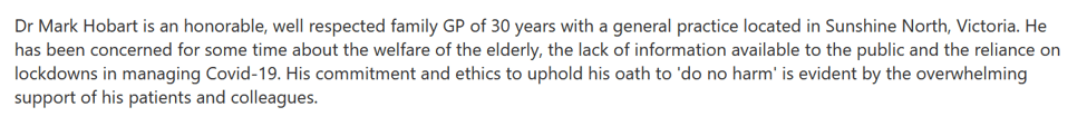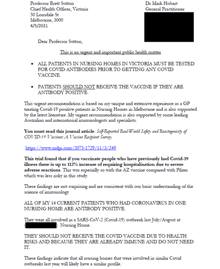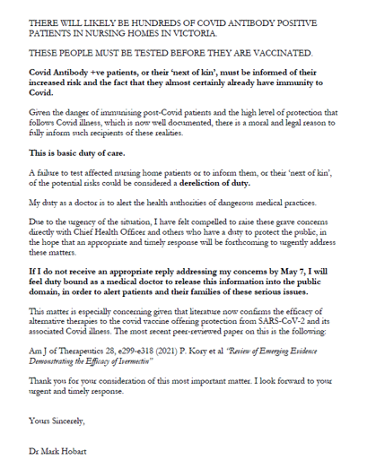He has grave concerns about the increased risks of adverse events following vaccination of recovered Covid-19 patients. His concerns were raised due to his own clinical experience and discussions with senior immunologists, virologists and infectious disease specialists. Dr Hobart decided to alert health authorities about his concerns regarding the proposed vaccination of his nursing home patients who had been diagnosed with Covid-19 illness last year and had fully recovered.
