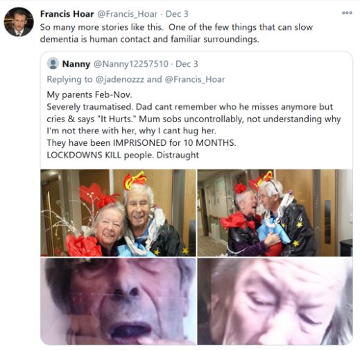 Lawyer Clare Wills was warning about horrific problems in UK Care Homes from at least mid-2020, largely due to lockdown which resulted in staff shortages; punishing isolation of vulnerable people reliant on social contact and routine; GPs diagnosing and prescribing drugs by telephone with inadequate vigilance; GPs determining cause of death by telephone; death certificates signed off by nurses. All in the name of “safety” as residents died in droves due to an appalling lack of care labelled Covid in the absence of standard medical attention or autopsy.