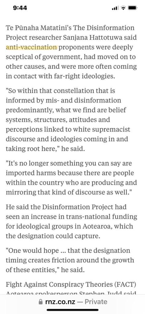 According to the New Zealand government, these people hold dangerous far right-wing ideologies. An actual department now exists to inform the New Zealand people of this new development in society, of opposition to government policy aka the “single source of truth”, being dangerous conspiracy theory.