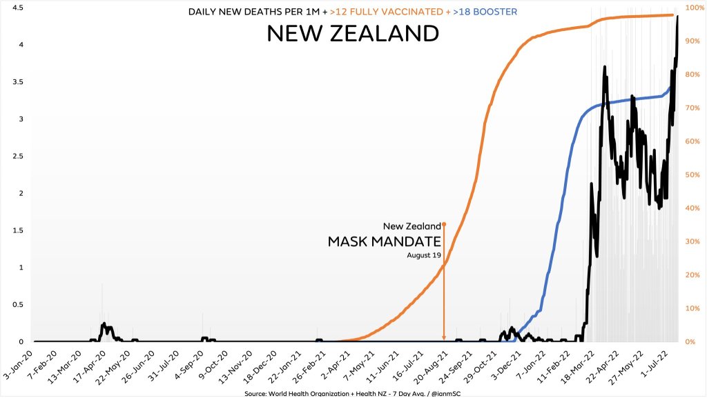 What might have happened to the epidemiology of Covid in New Zealand had we followed established public health practices such as those outlined by the World Health Organisation in 2019? We suggest far better outcomes than those shown in the following graphs, by data analyst and author of a recent book titled Unmasked: The Global Failure of Covid Mask Mandates, Ian Miller. It appears as though we employed a “let it rip” strategy?
