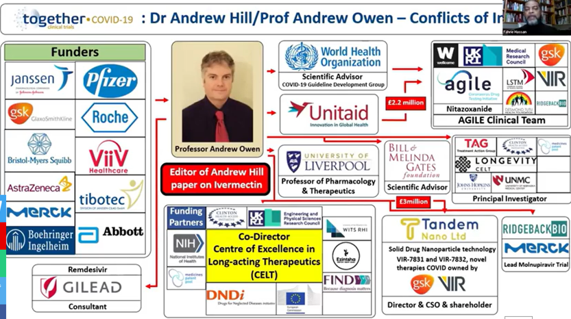Professor Owen’s loyalties are shown above, taken from Fahrie Hassan’s riveting presentation below. This is one example of many, of the maze of conflicts between power, money and the value of human life. Good people are quick to assume human life is always a priority. Conflicted people make no such assumption. Anyone who has worked in an impoverished country, where the rights of health workers to enrich themselves reign over the rights of the sick to receive care, understands this.