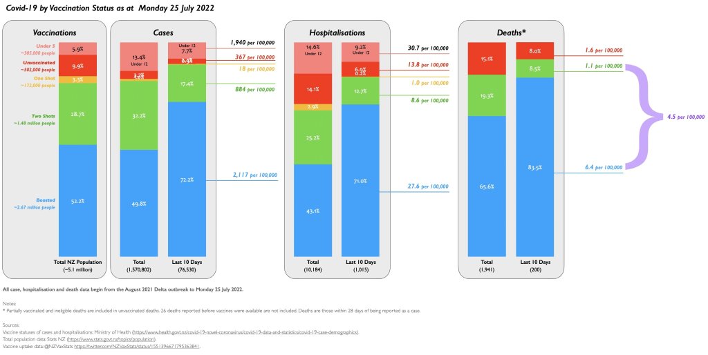 New Zealand’s own statistics show that the inoculations are causing harm, not benefit, to the population. Whilst 52% of the population is boosted, they account for 83.5% of Covid-related deaths, at a rate of 6.4 per 100,000 compared to 1.6 per 100,000 for those not fully vaccinated (unvaccinated and partially vaccinated are categorised together). That is the exact opposite of how a “vaccine” is supposed to impact a population, regardless of the various testing/diagnostic frauds.