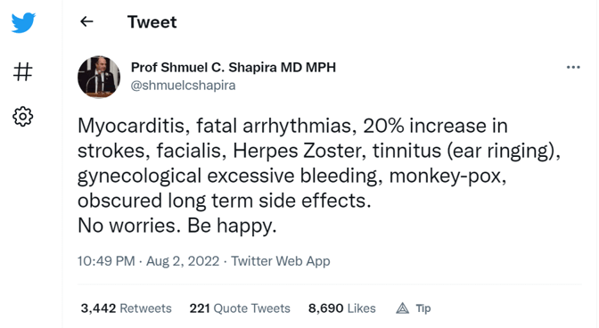 Professor Shmuel Shapira, Director of the Israel Institute for Biological Research between 2013 and 2021, has connected monkeypox with Covid-19 inoculations. Claiming to have had three Pfizer doses and now suffering a significant post-injection injury himself, Professor Shapira is speaking out against both the ineffectiveness of, and the harms being caused by, these products. On 2 August 2022 he tweeted the following: