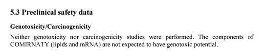 Despite introducing a brand new pharmaceutical product to market in rushed circumstances with numerous manufacturing concerns, Pfizer “assumed” that there was no need to look for potential carcinogenic effects. Those who received the product for whatever reason, along a wide spectrum between faith in the “safe and effective” narrative, to tortuous coercion, are in fact experimental subjects. Pfizer’s Nonclinical Overview trial document released in March 2022 states the following.