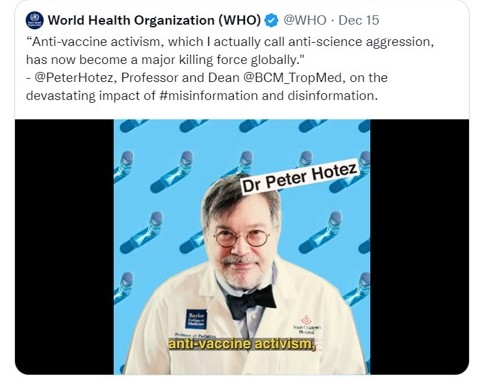 Oh and according to Peter Hotez, the grizzly research scientist at Baylor University, anti vaxxaaahhs are killers. His idea is promoted by World Health Organisation. Many consider Hotez and certain of his funders and partners including WHO, to be the actual killers. It seems that Hotez has even admitted as much.
