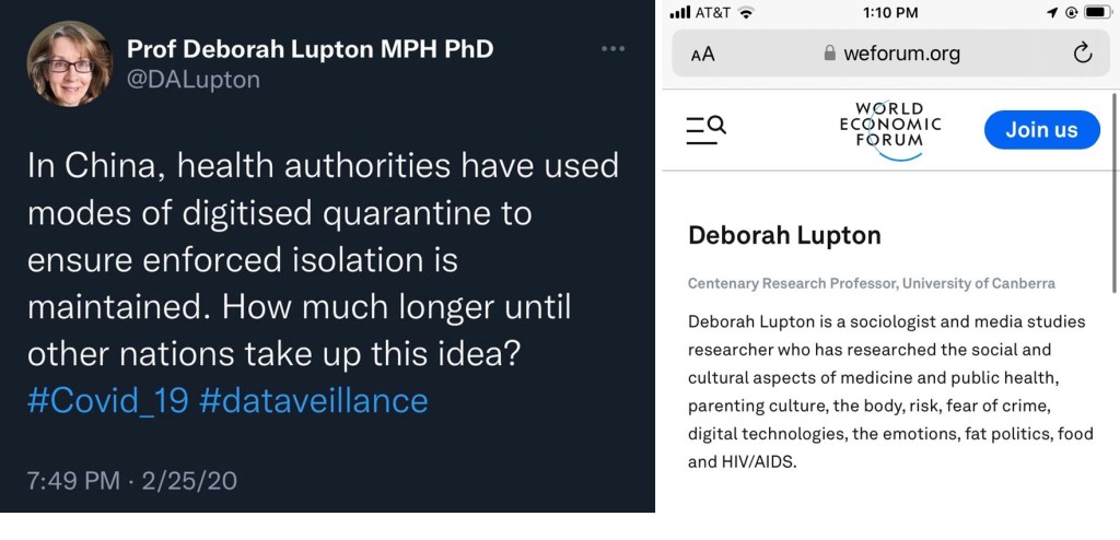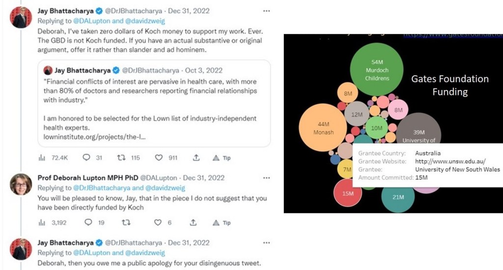 Australia is full of “mainstream scientists” following along with this. Is their narcissism more important than the fundamental rights of everyone else? Meet Professor Deborah Lupton, a sociologist at UNSW who wants the world to believe that three of the world’s most esteemed infectious disease epidemiologists who met at their own expense in October 2020 to write a very standard public health declaration, did so with “dark money”. As per standard strategy, what she accuses others of is apparently a deflection of reality…