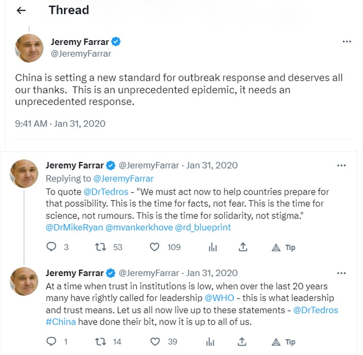 Added to this is evidence from the so-called “Fauci Emails” obtained by a Freedom of Information Act lawsuit filed by BuzzFeed News, which show that Farrar had an official role at WHO as early as February 2020, to “to act as the Board’s focal point on the COVID-19 outbreak, to represent and advise the board on the science of the outbreak and the financing of the response“. He had also previously chaired the WHO scientific advisory group. These established connections were absent from the WHO December press release about Farrar’s new position as Chief Scientist.