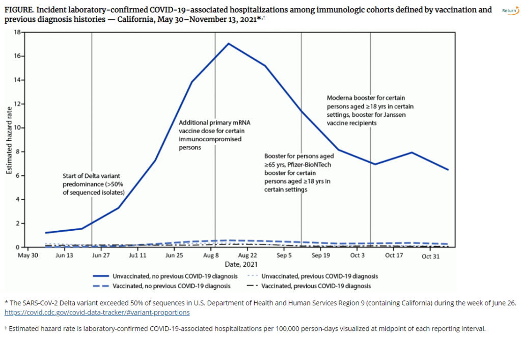 Post-infection (‘natural’) immunity produces clinical protection to COVID-19 at least as broad as and more sustained than that produced through vaccination (Ref, Ref, Ref, Ref, Ref). WHO is also aware that vaccination added to natural immunity adds minimal clinical benefit (well demonstrated in the CDC chart below). When WHO states that only “28% of old people and 37% of health workers” in low-income countries have received COVID-19 vaccines, and fewer in the general population, they know that nearly all the unvaccinated also have effective immunity, at least against becoming severely ill. WHO wishes to spend this unprecedented budget to mass vaccinate an immune population.