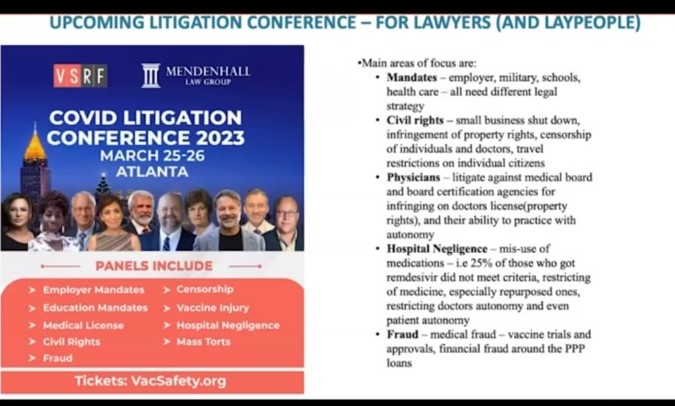 - On March 25-26 there is a Litigation Conference in Atlanta where a number of doctors will be speaking. It is open to the public, especially anyone who might want to find out what action they can take against harms experienced.