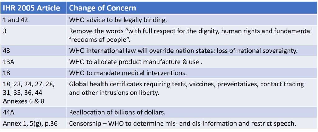 This International Negotiating Body are working towards introducing a new global treaty to give WHO powers over every nation state with relation to pandemic responses, including pre-pandemic, pandemic, post-pandemic and inter-pandemic times. They are also making significant changes to the existing International Health Regulations, such as the following few examples of at least 300 recommended changes. Read more here and here.