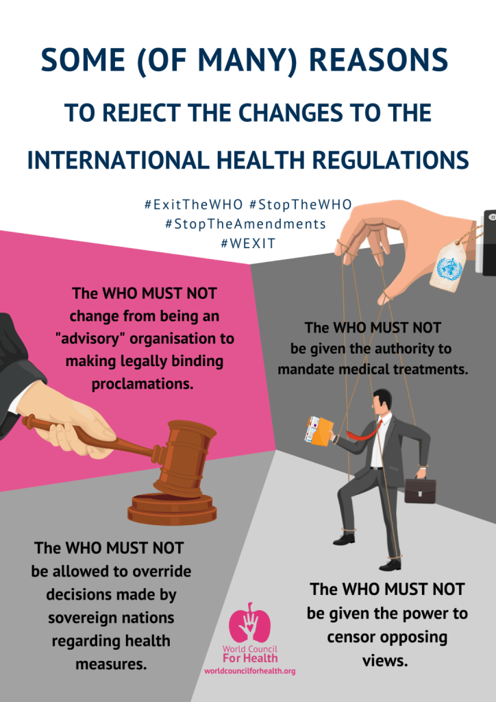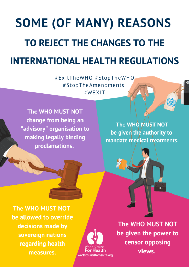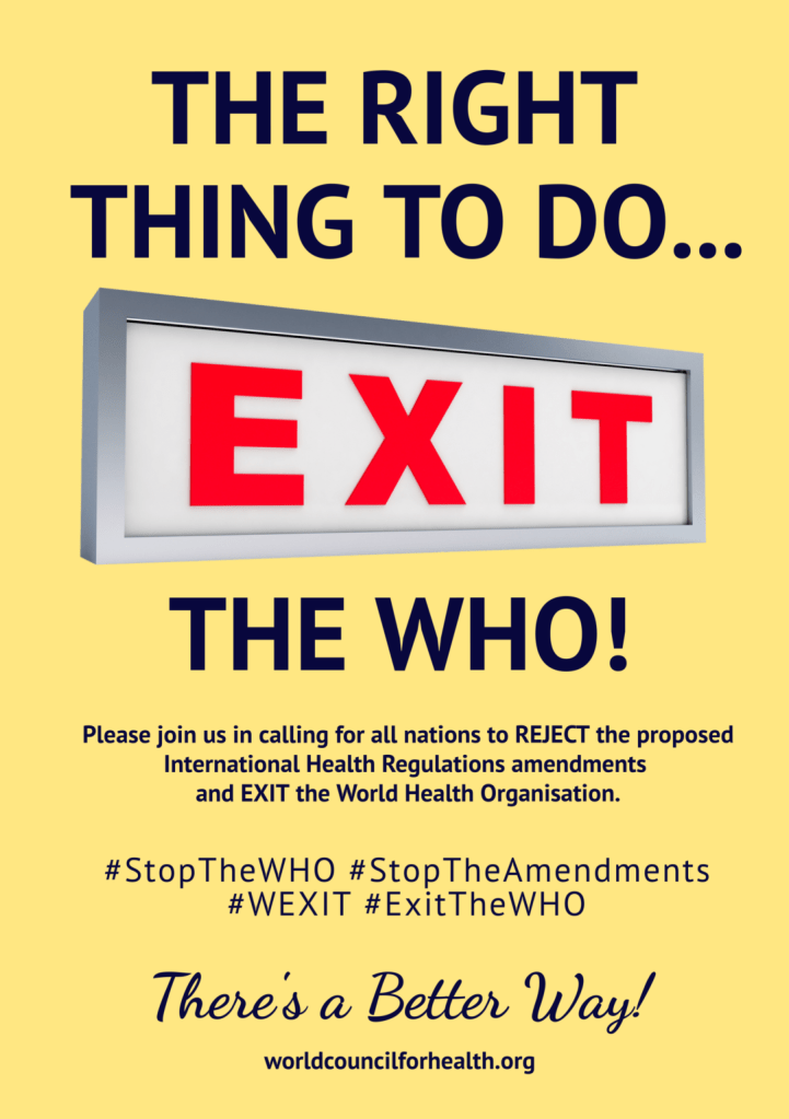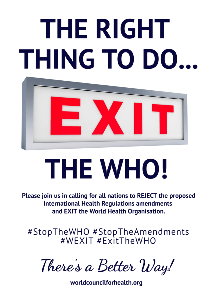 Please save and share the images below, both online and in person. When sharing information on social media, use the hashtags #StopTheWHO, #ExitTheWHO, #wexit, and #StopTheAmendments. The WCH Law and Activism Committee is currently taking video submissions in response to the prompt: Tell us in a short video the number one reason why your country should exit the WHO. Learn more and submit your video.