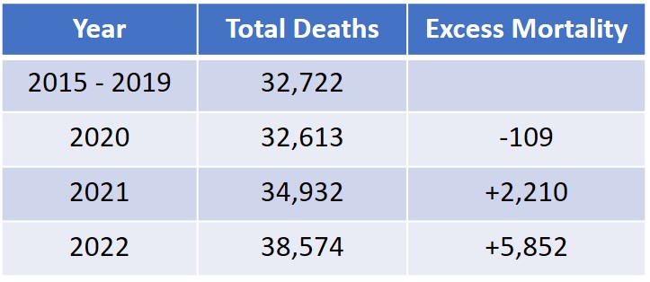 Whilst Sir Ashley Bloomfield and other government-attached advisors continue to inform New Zealanders that they remain in “negative excess mortality”, the official figures speak for themselves. (2015-2019 is the average total deaths for the five years pre-pandemic, routinely used for comparison of excess mortality).