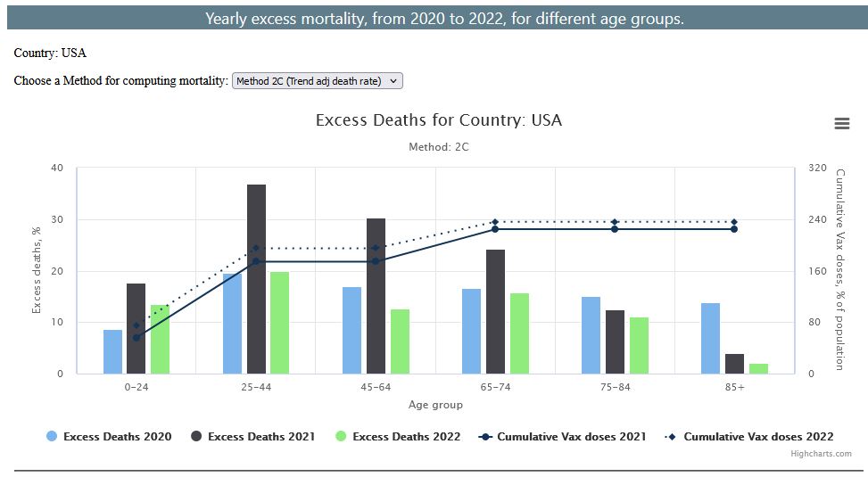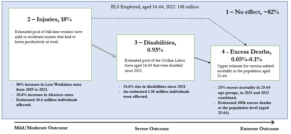 Almost 1% suffered some kind of disability, and worse, 0.05 – 0.1% died — perhaps as many as 1 in 1,000 people died, and this is from the healthy 18-64 age group. It represents a 23% increase in excess deaths in this otherwise healthy group during 2021 and 2022. In his interview with Tucker Carlson a few weeks ago Ed Dowd explained then that the excess deaths were higher in the healthy working age part of the population than in the unemployed — probably due to medical treatment mandates that applied to workers and not to unemployed people.