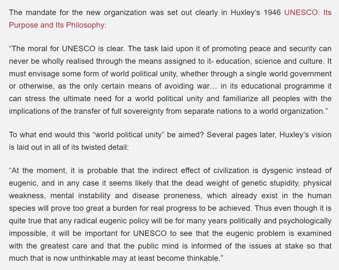 This is a dark agenda. Those pushing it consider other humans as lesser than themselves. This is not a new idea. Throughout history most civilisations have had slaves. There is a line of continuity through the Malthusian movement in the late 1800s, to eugenics in the 1920s and 1930s and Nazi public health in the 1930s-1940s. In the founding document of UNESCO, Julian Huxley wrote about eugenics. He then helped steer the environmental movement which moved to the biosecurity agenda, which is now moving towards the One Health agenda.
