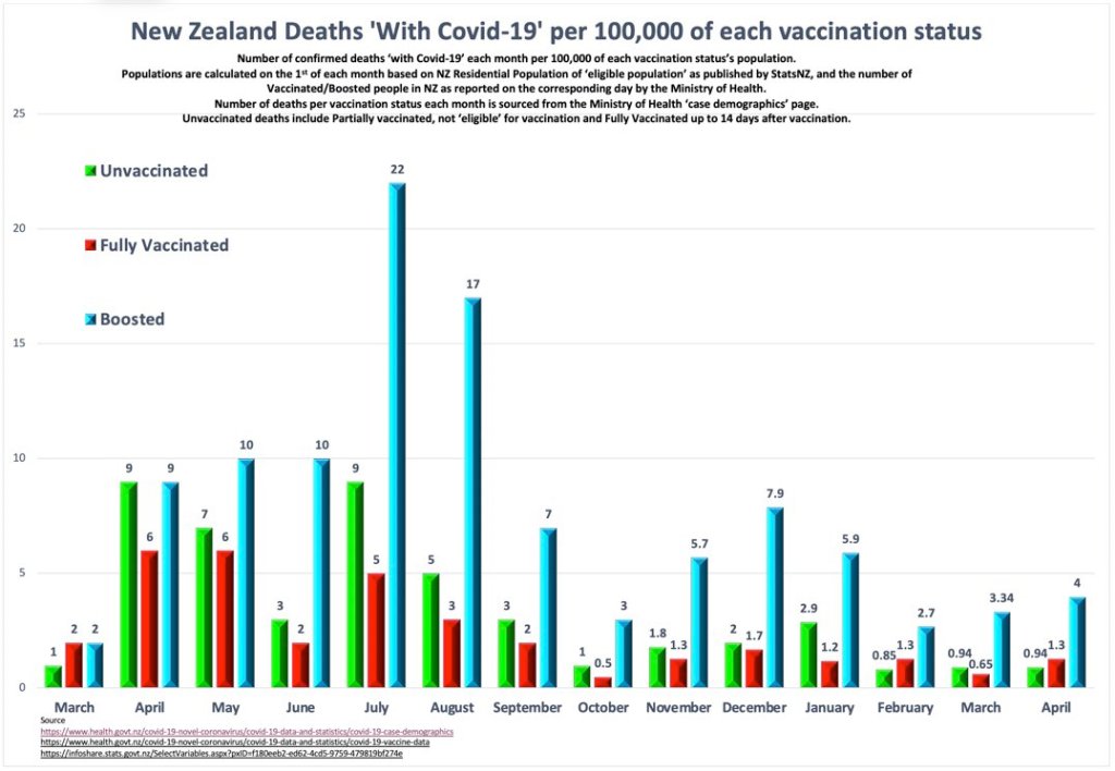 The reasons for increased illness and death seen alongside increased numbers of doses taken are many and still becoming known. From May 2022 to April 2023 NZ’s mortality rates “with covid” are over-represented in the boosted population. This is the exact opposite of the impact that a “vaccine” should have. The same patterns are being seen worldwide.