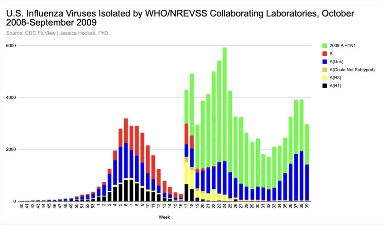 Along the x-axis are weeks in the year, starting from week 40 of 2008 (first week in October), through to end of September (week 39) in 2009. The y-axis shows the number of positive tests per week, colour coded by influenza subtype.