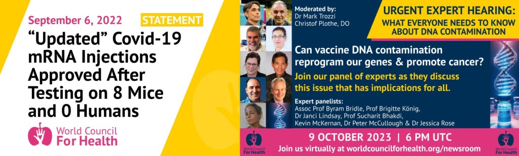 The World Council for Health, alongside many other medical and science groups and individuals, are calling for the withdrawal of these products from the market due to multiple safety concerns and lack of efficacy. They are hosting an urgent expert hearing on 9 October 2023, to share concerns with the public about the detection of DNA contamination in the vials which is associated with concerns including risk of ongoing production of spike protein from the cells, thrombotic events (DVTs, heart attacks, strokes) and cancer.